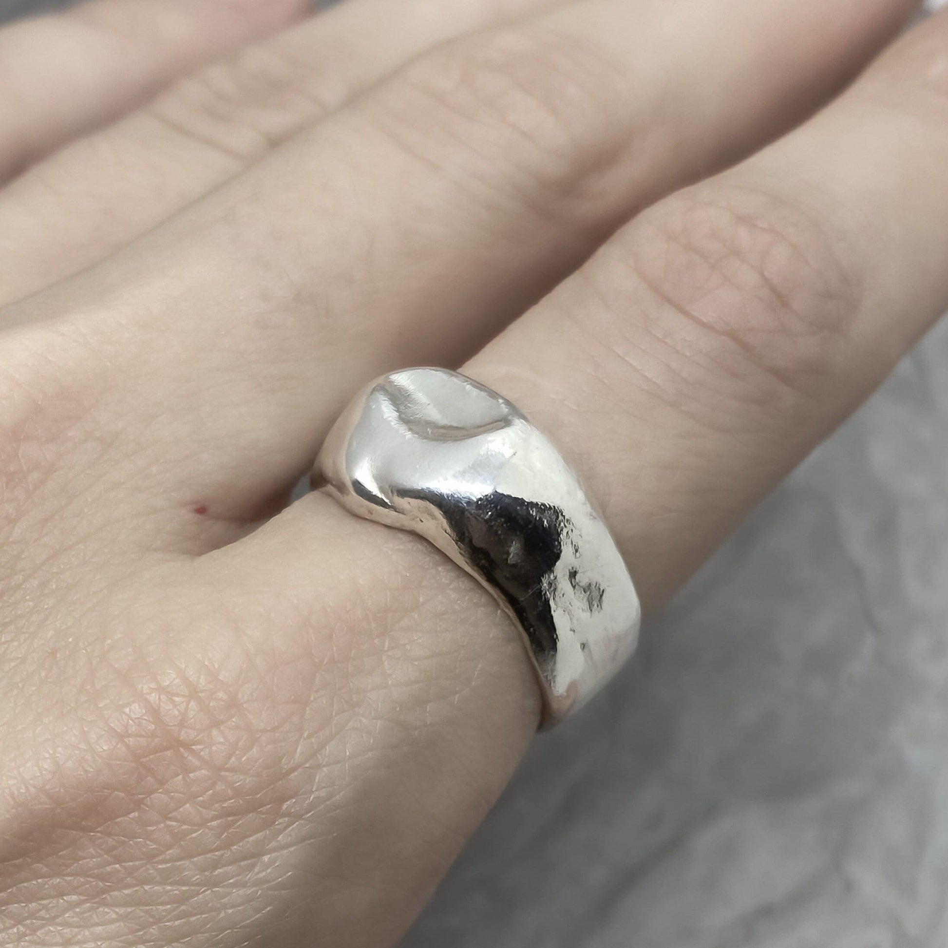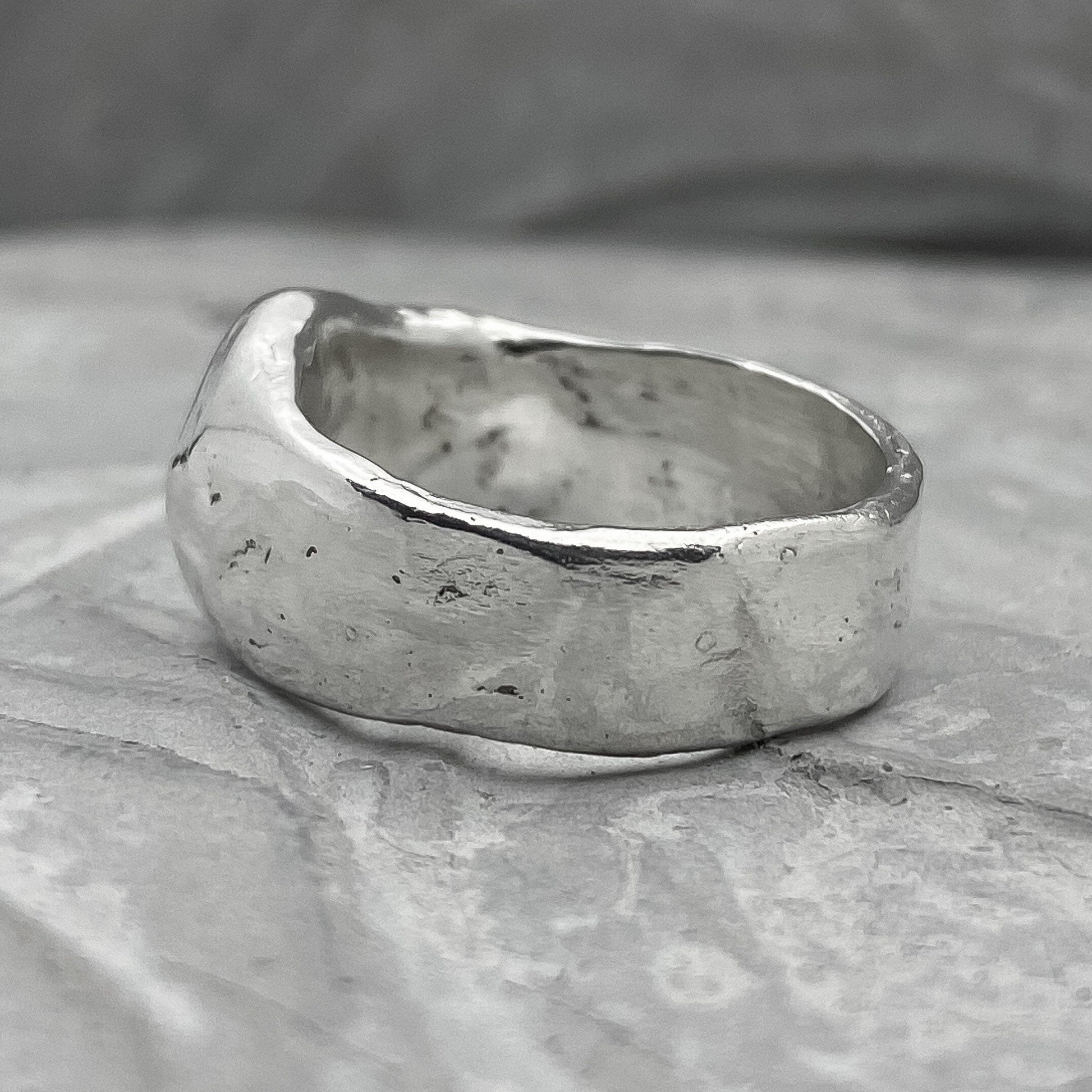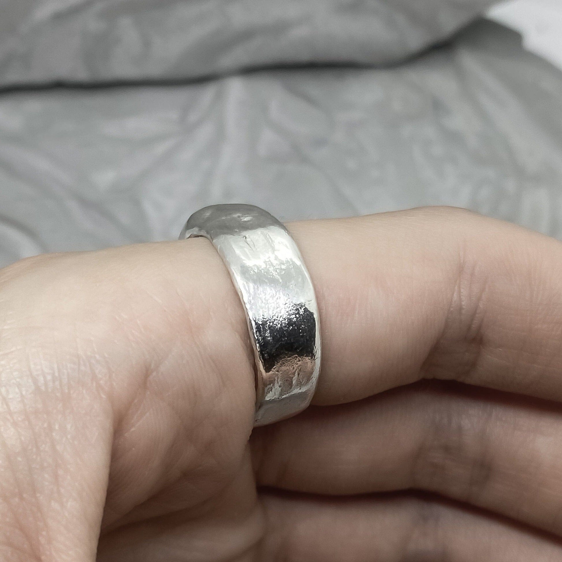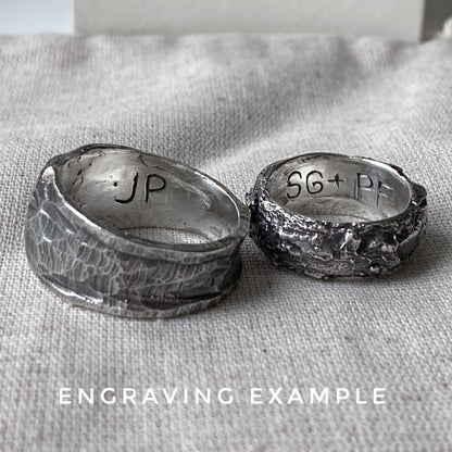 Description: The wide band of silver resembles liquid metal. The glossy texture becomes matte over time and acquires a unique texture that reflects the character of its owner. It is ideal for daily wear. This ring can be a great choice for engagement rings if you want something minimal and stylish. My wife and I chose just such a texture for our wedding rings, and it is interesting for us to watch how they change from year to year, but remain just as beautiful. Inside the ring, you can place a simple inscription or your initials.