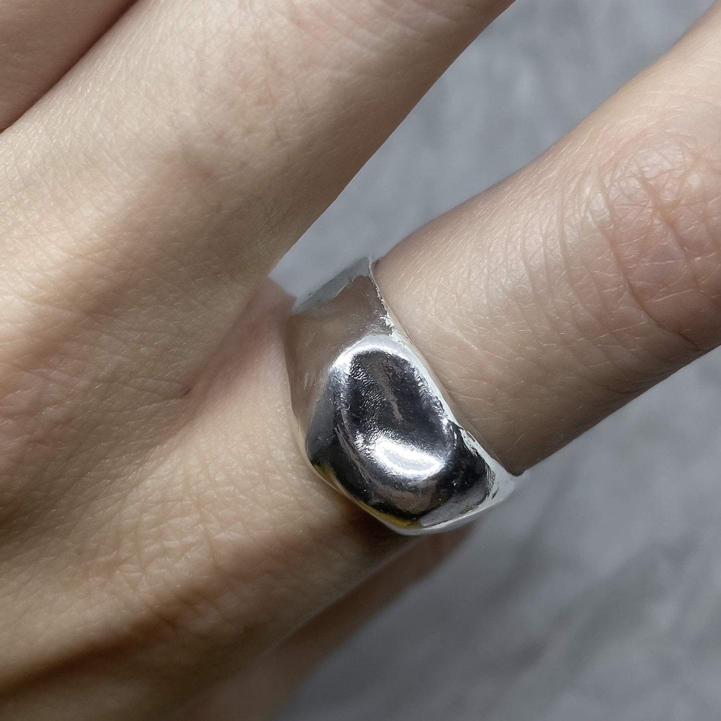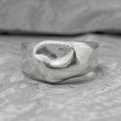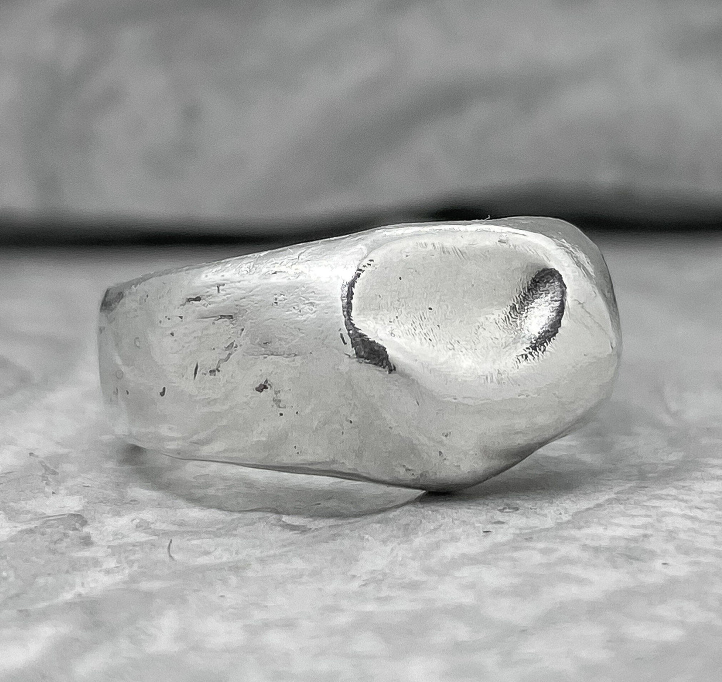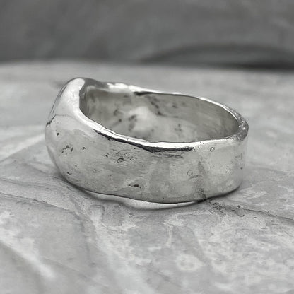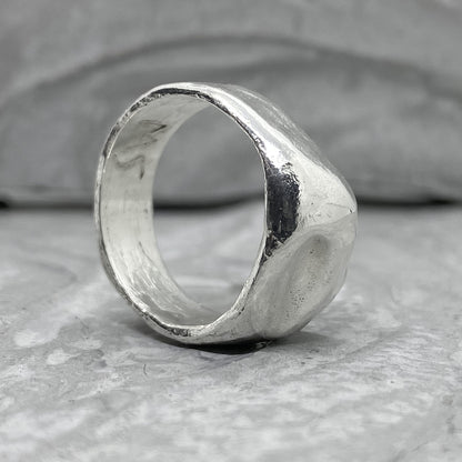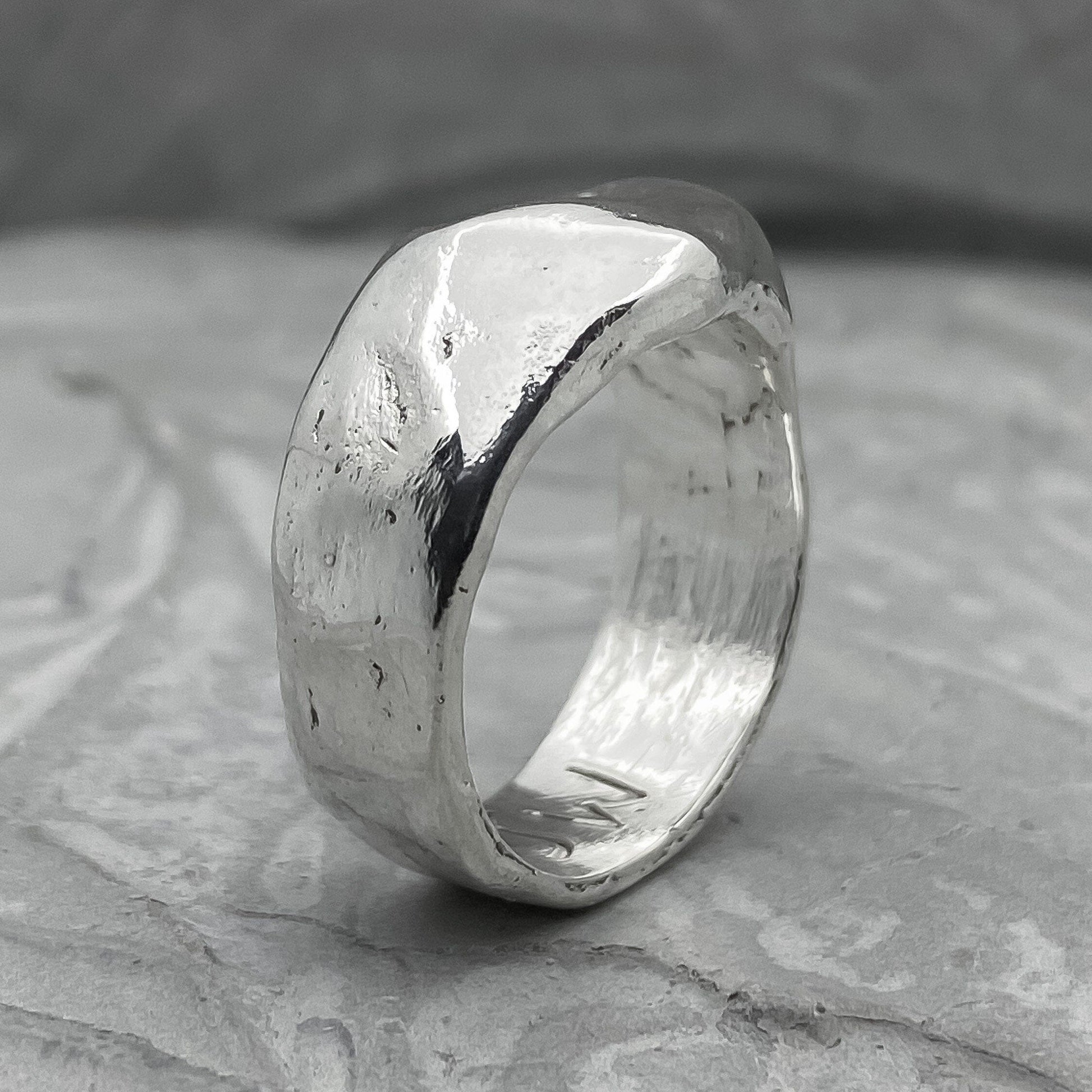 Description: The wide band of silver resembles liquid metal. The glossy texture becomes matte over time and acquires a unique texture that reflects the character of its owner. It is ideal for daily wear. This ring can be a great choice for engagement rings if you want something minimal and stylish. My wife and I chose just such a texture for our wedding rings, and it is interesting for us to watch how they change from year to year, but remain just as beautiful. Inside the ring, you can place a simple inscription or your initials.