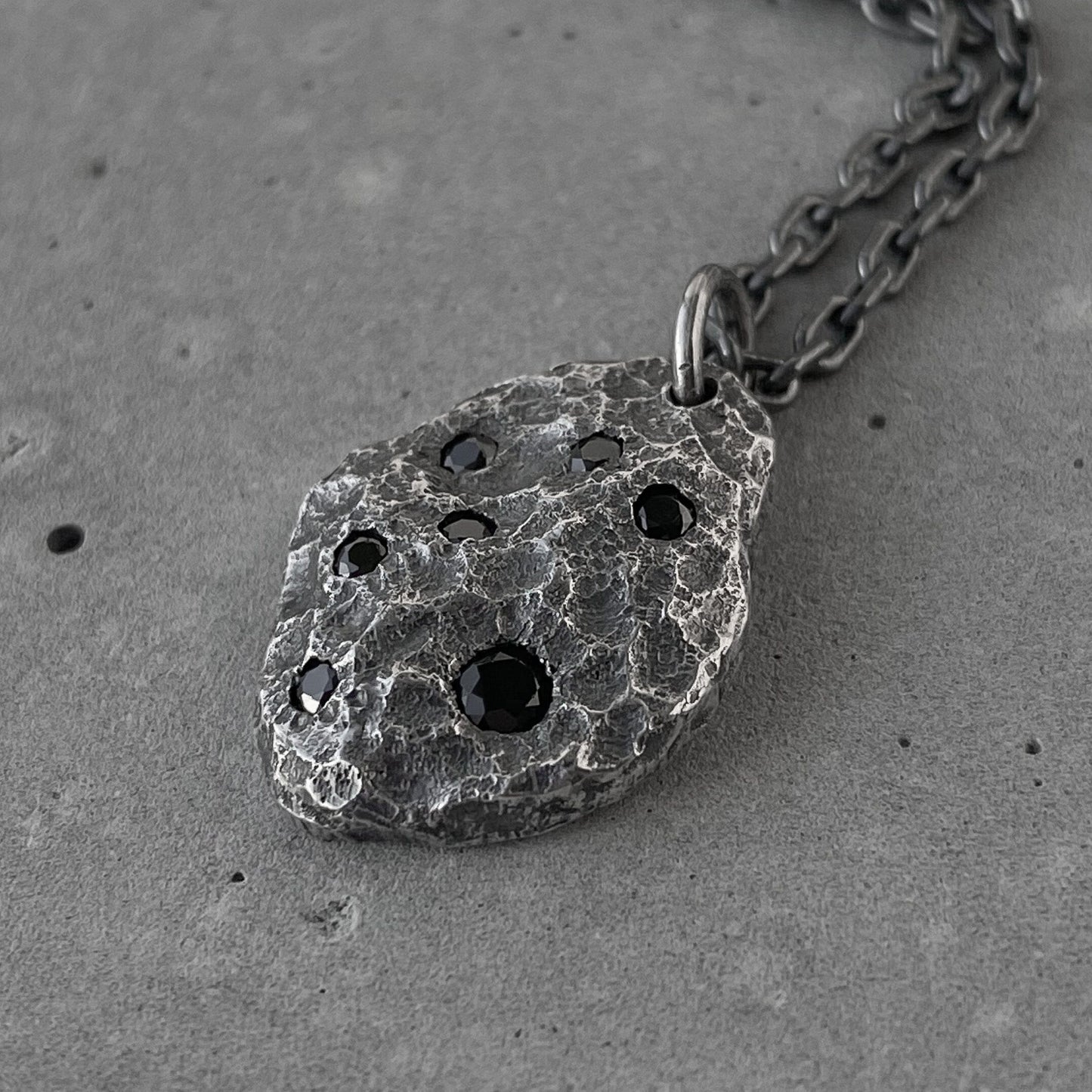 The shape and texture of the pendant are covered with grooves reminiscent of the surface of a meteorite. The stones we use for extra sparkle are natural black spinel, which is similar in appearance to diamond, but its value allows us to create equally beautiful pieces at a reasonable price.