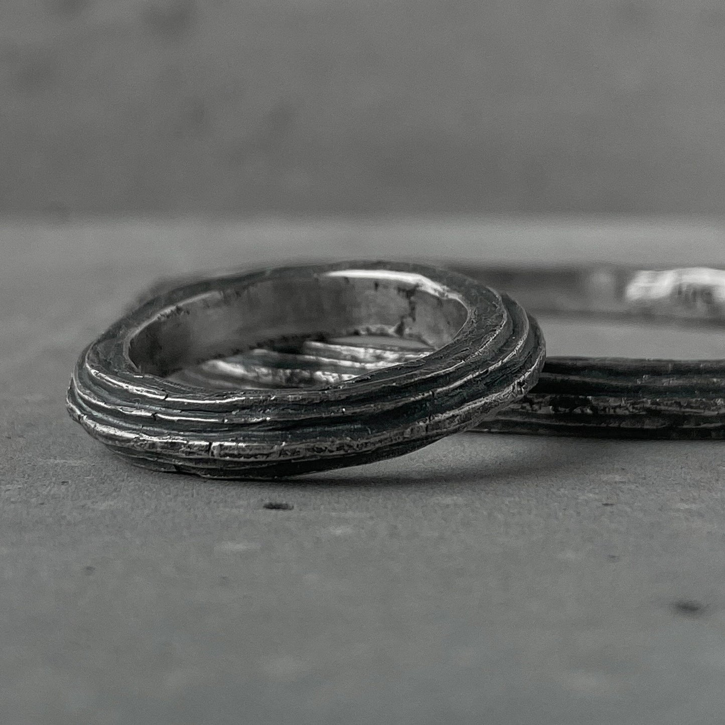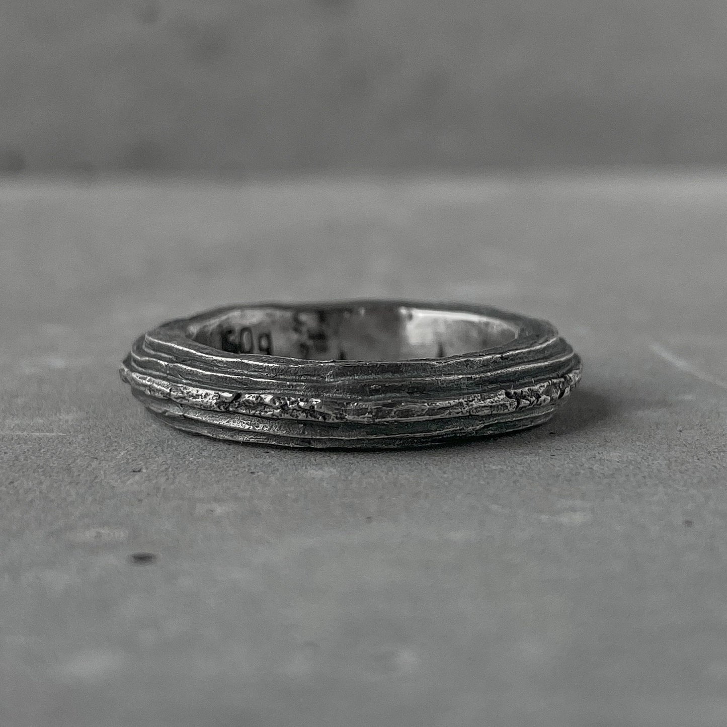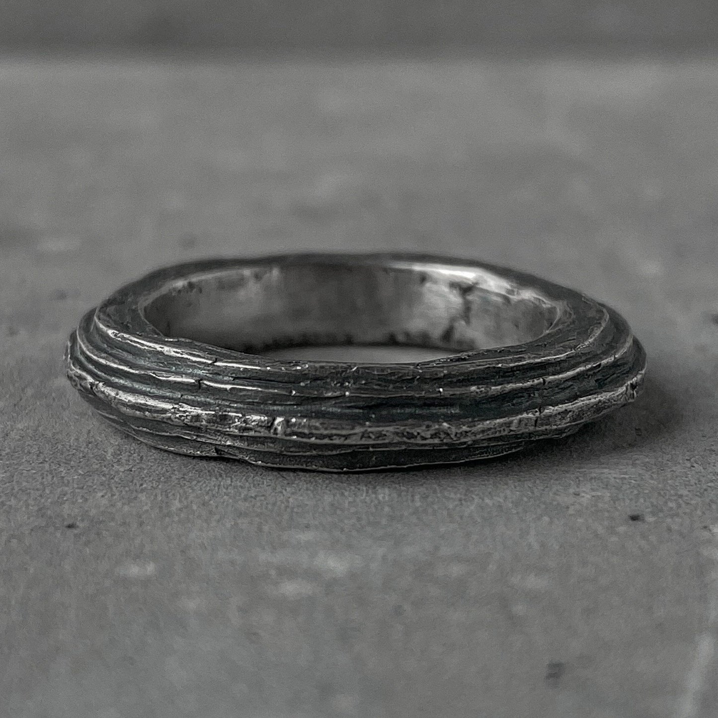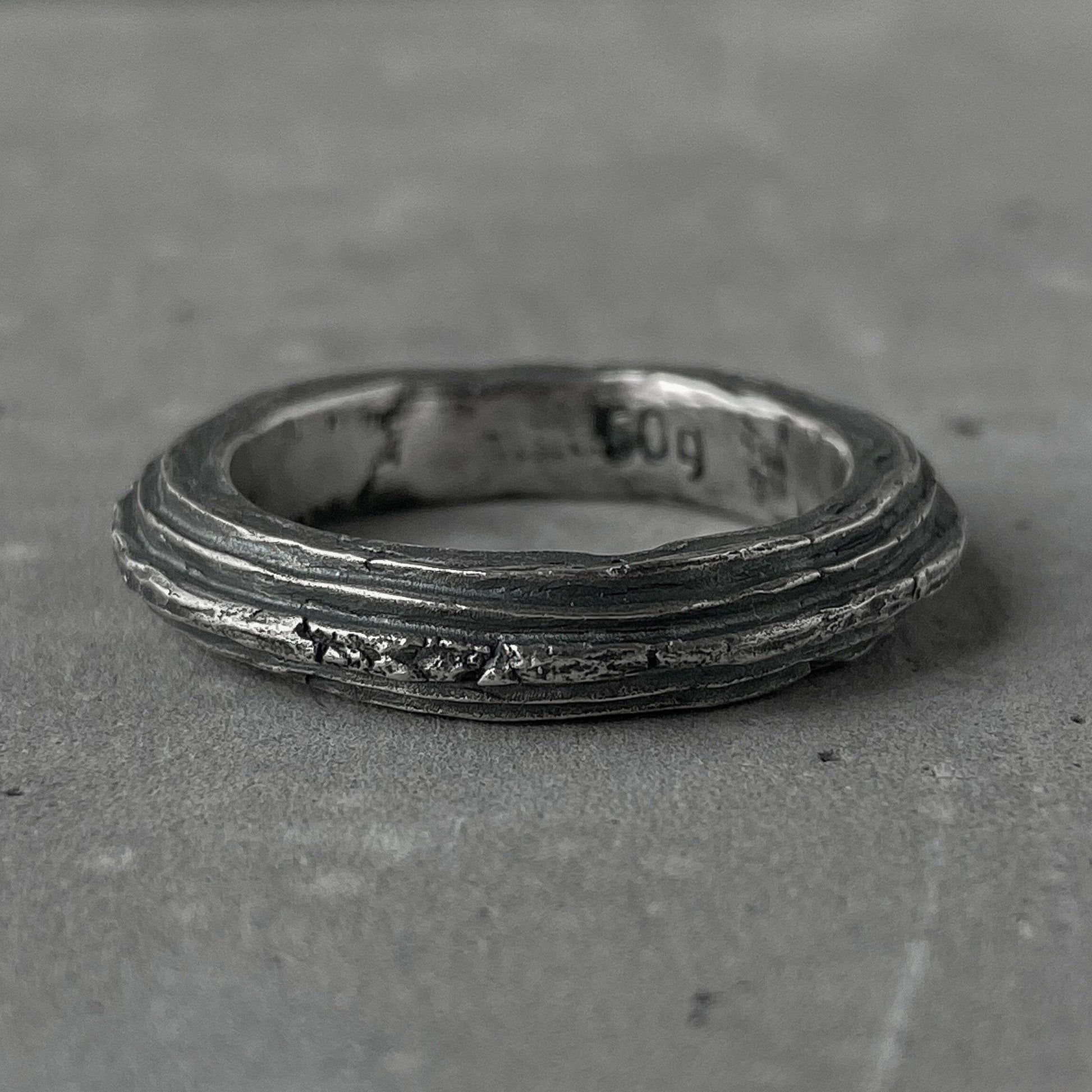 ORBIT Ring – rugged silver ring with raw texture and volcanic oxidation