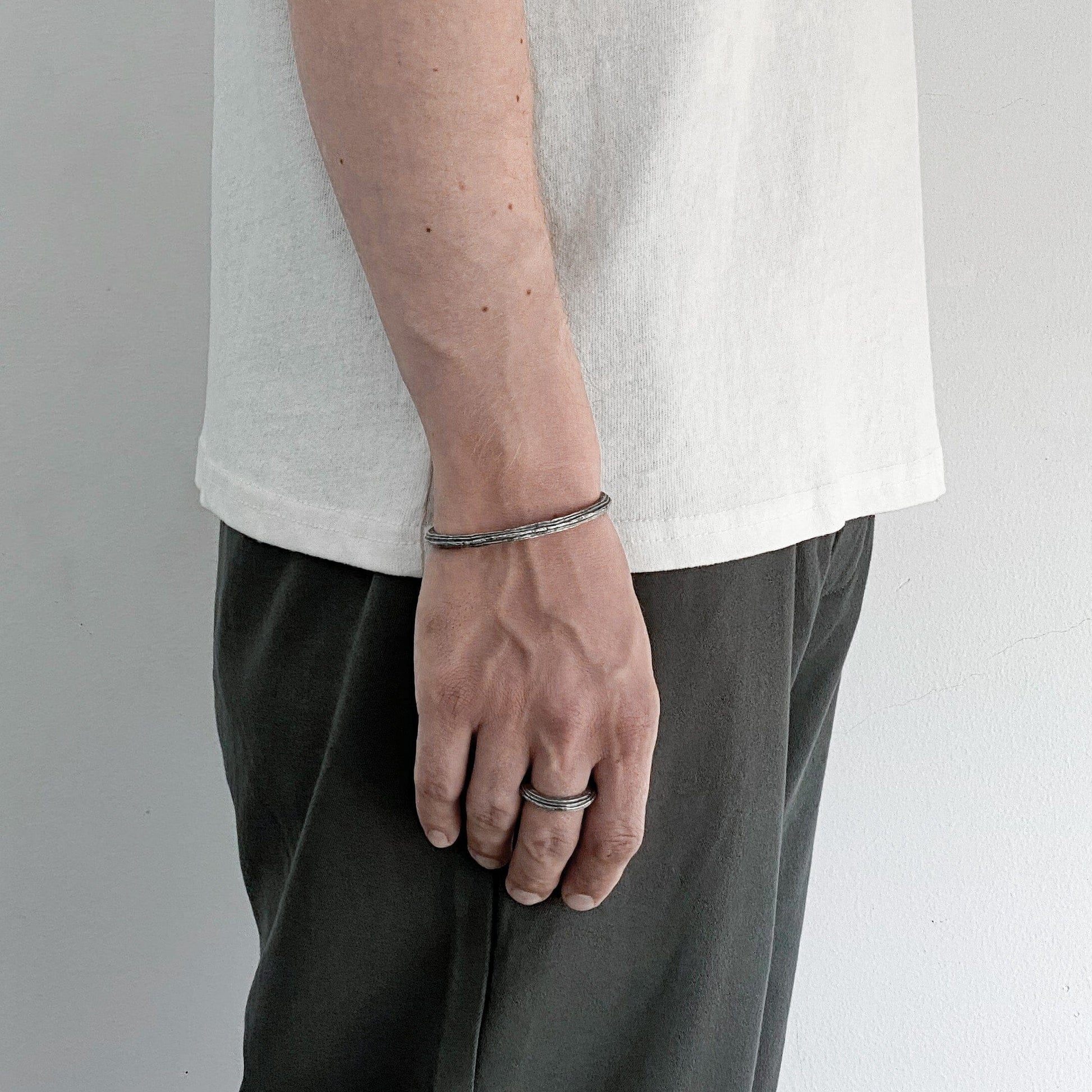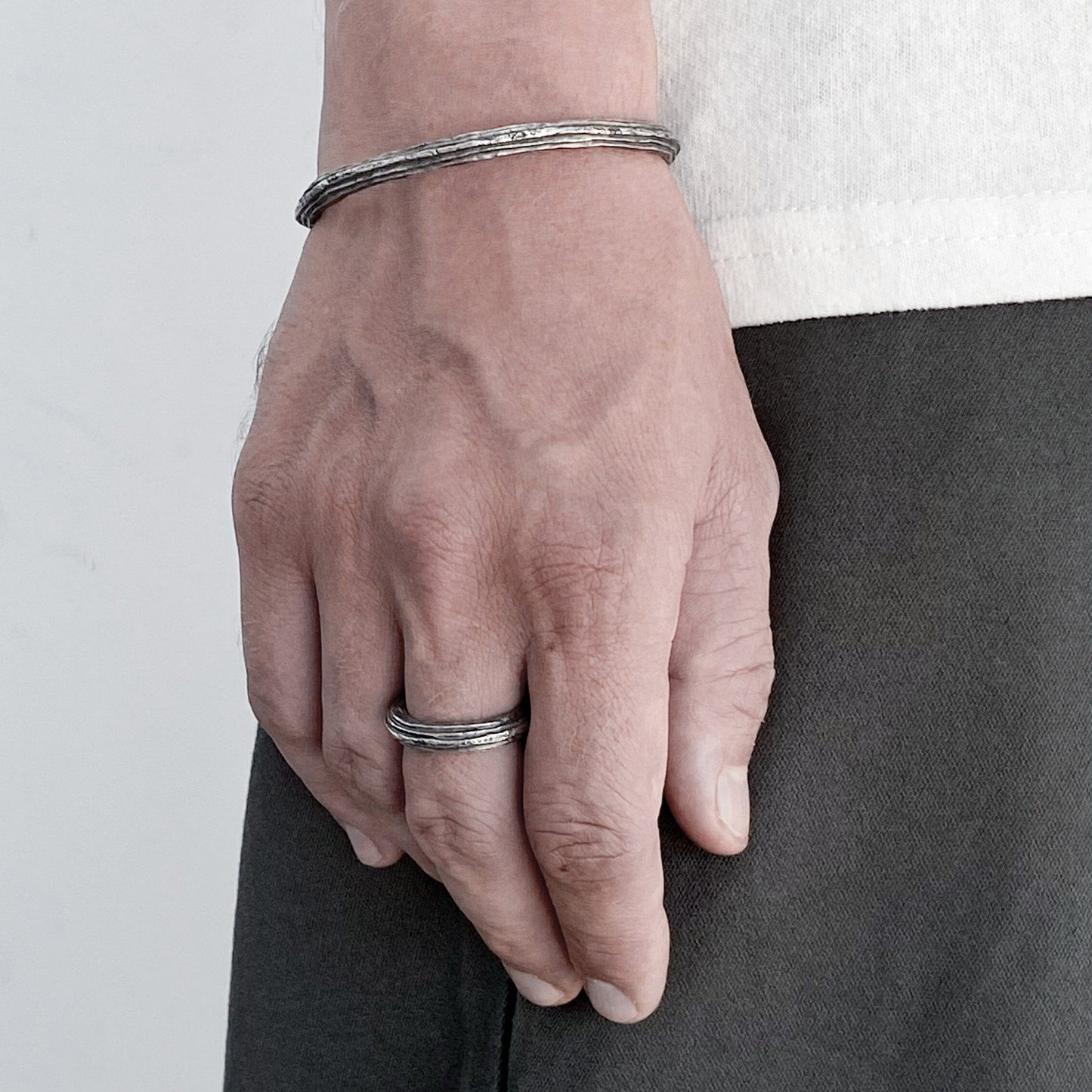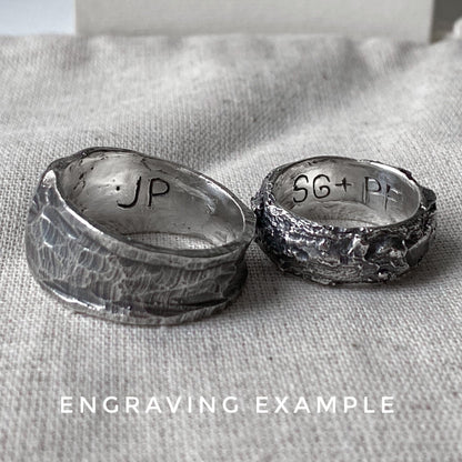 A raw-textured silver ring inspired by celestial movement and natural erosion. The ORBIT Ring’s uneven surface mimics the rough terrain of asteroids and planetary rings, embodying a balance between chaos and structure. The deep, organic patina is achieved through volcanic oxidation, a process using natural sulfur collected from Indonesia’s Ijen volcano. This finish enhances the raw, unrefined character of the ring, creating a sense of depth and history in every detail.