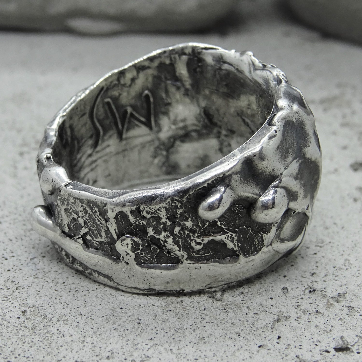 - wide ring with an imprint and a combination of textures of stone and molten metal