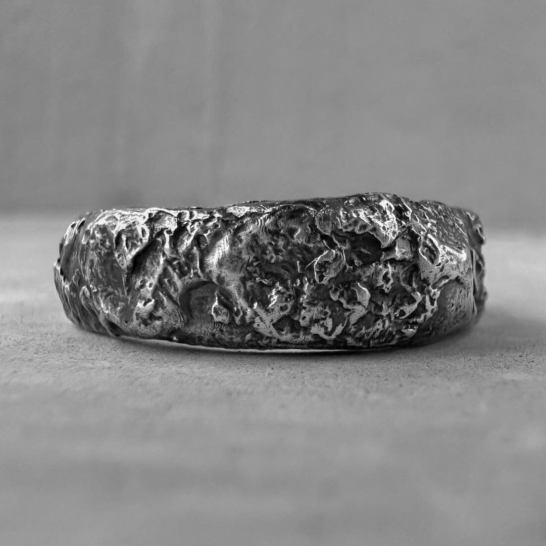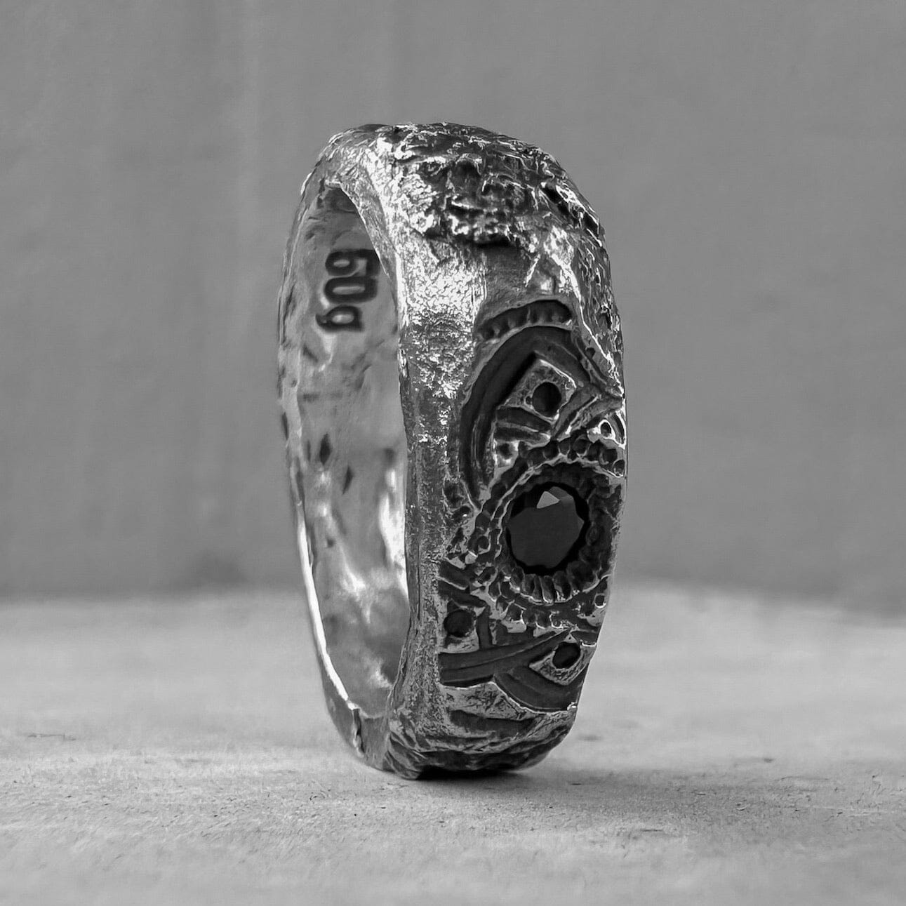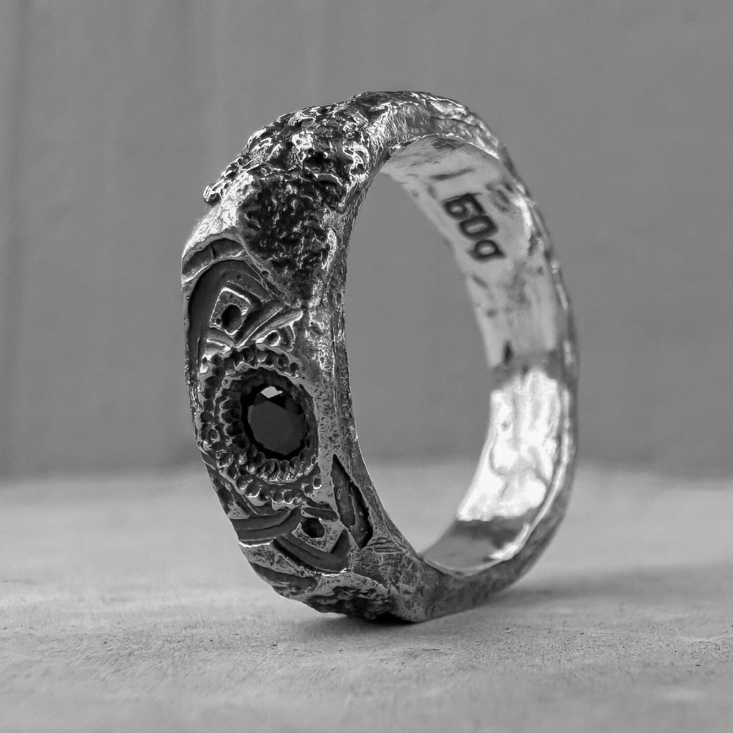 - silver ring with rich stone texture, engraved mandala and black diamond in the center. Textured band ring