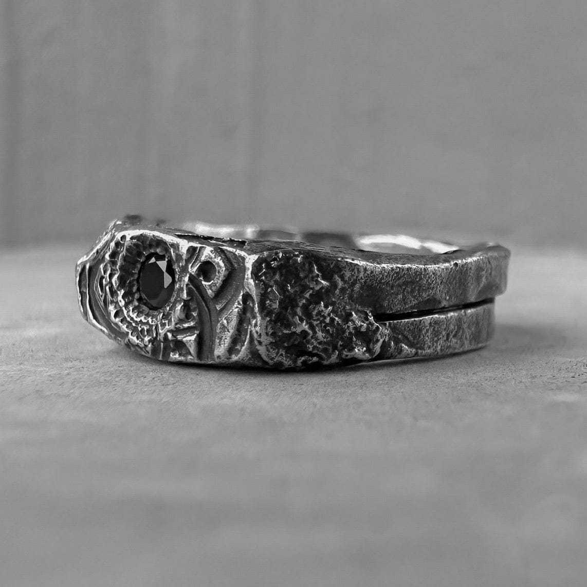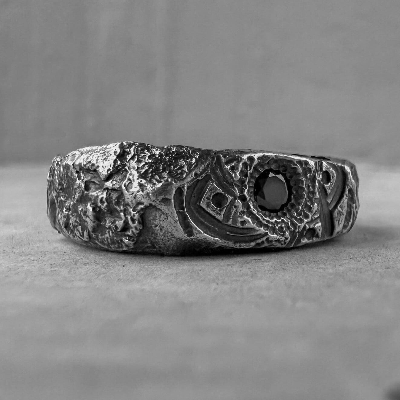 MANDALA is a unique silver ring, handmade using a combination of techniques. The main accent of this model is the image of the Mandala, personifying the model of the universe, the "map of space" imprinted on the stone. I took a cast for it from a small section of the wall of an ancient Buddhist temple in Laos. Also on this ring you will see integrated monochrome areas, as if hinting at our present. The combination of history in the texture of the stone and modernity in the purity of lines creates an incomparable form. The image of the mandala is always created from the center to the edges, so the central fragment is decisive. The black diamond is the Center of the mandala - our "I", representing the core of the Universe. The place From where everything comes and where everything returns.