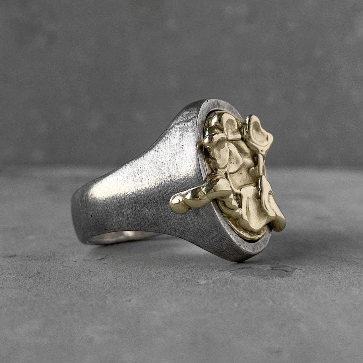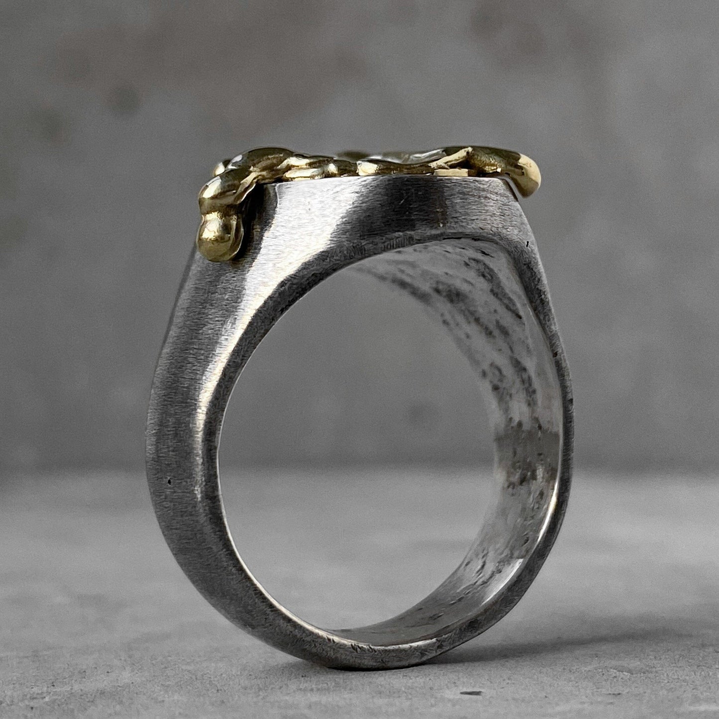 DESCRIPTION: Bague MAKER'S MARK - Une bague en métal fondu magnifiquement texturée sur une chevalière. C'est mon association avec une bouteille de whisky du Kentucky, une entreprise qui scelle toutes les bouteilles avec de la cire fondue, créant de belles taches dessus. Comme un bon whisky, vous aurez envie de déguster cette bague. Plus vous le regardez longtemps, plus il devient beau pour vous.