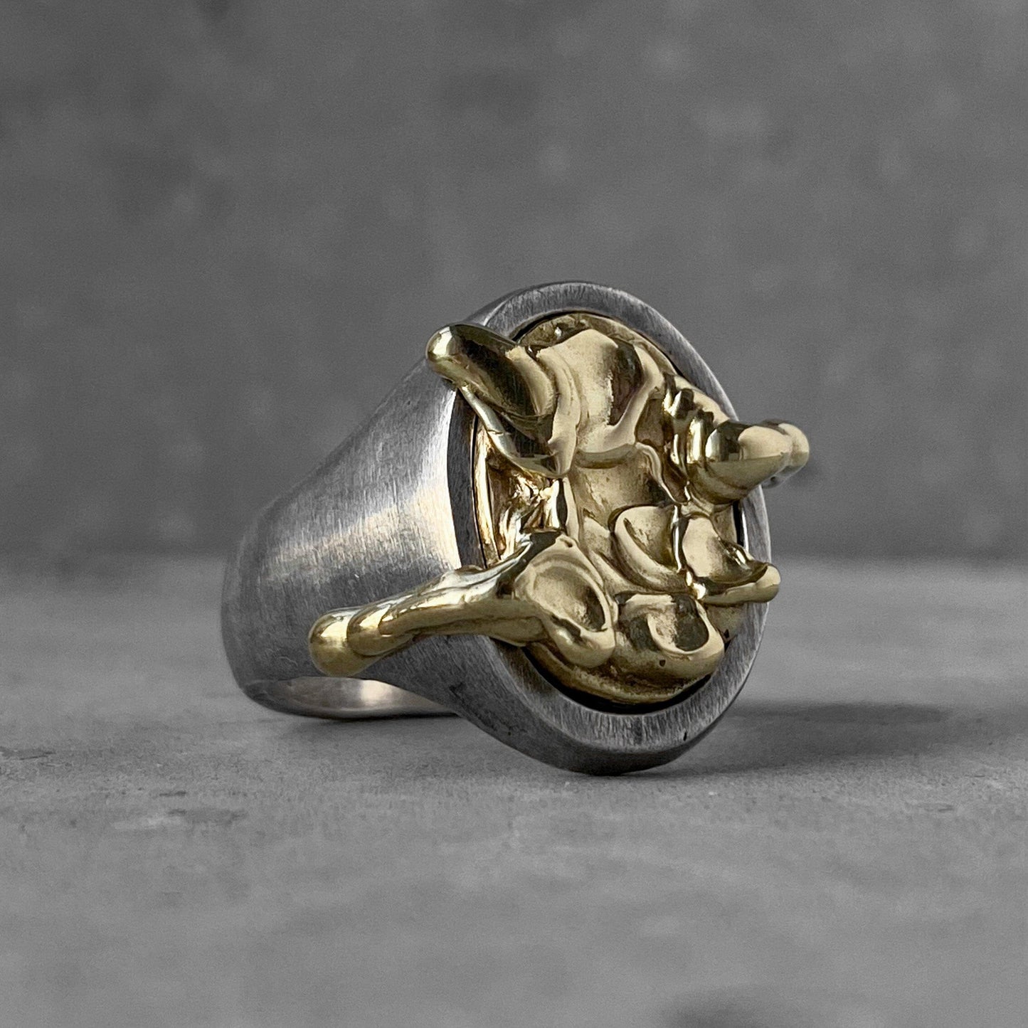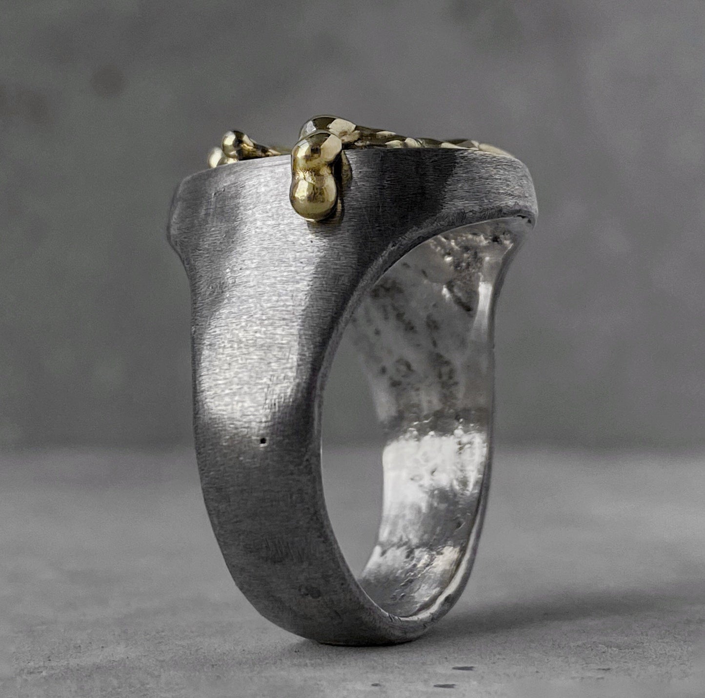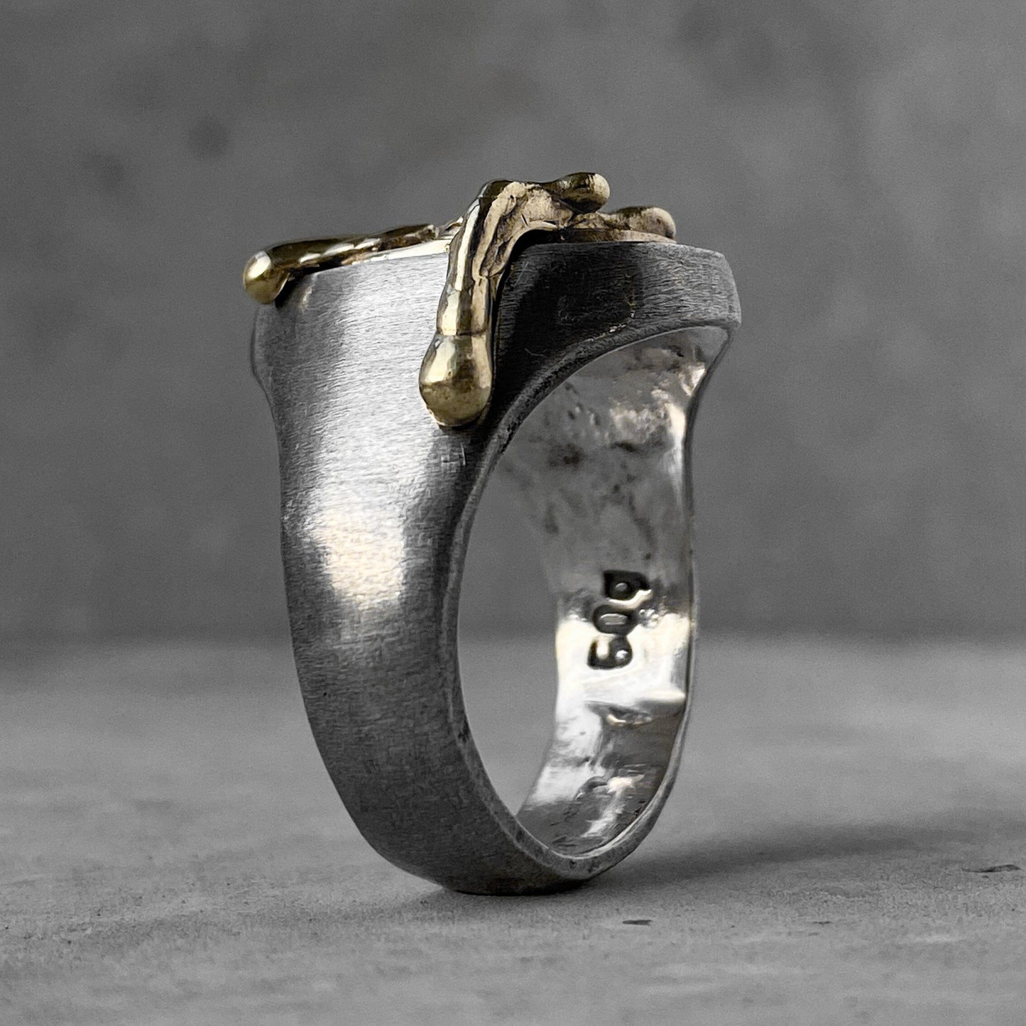 Tous les produits sont oxydés avec du soufre volcanique que nous avons collecté lors d'un voyage en Indonésie, ce qui les rend encore plus uniques. Chacun y trouvera quelque chose pour lui-même. Ajustement confortable. Il a fière allure sur la main à la fois seul et en combinaison avec d'autres bagues, se complétant parfaitement les uns les autres et votre image. Il deviendra le point culminant discret de votre image.
