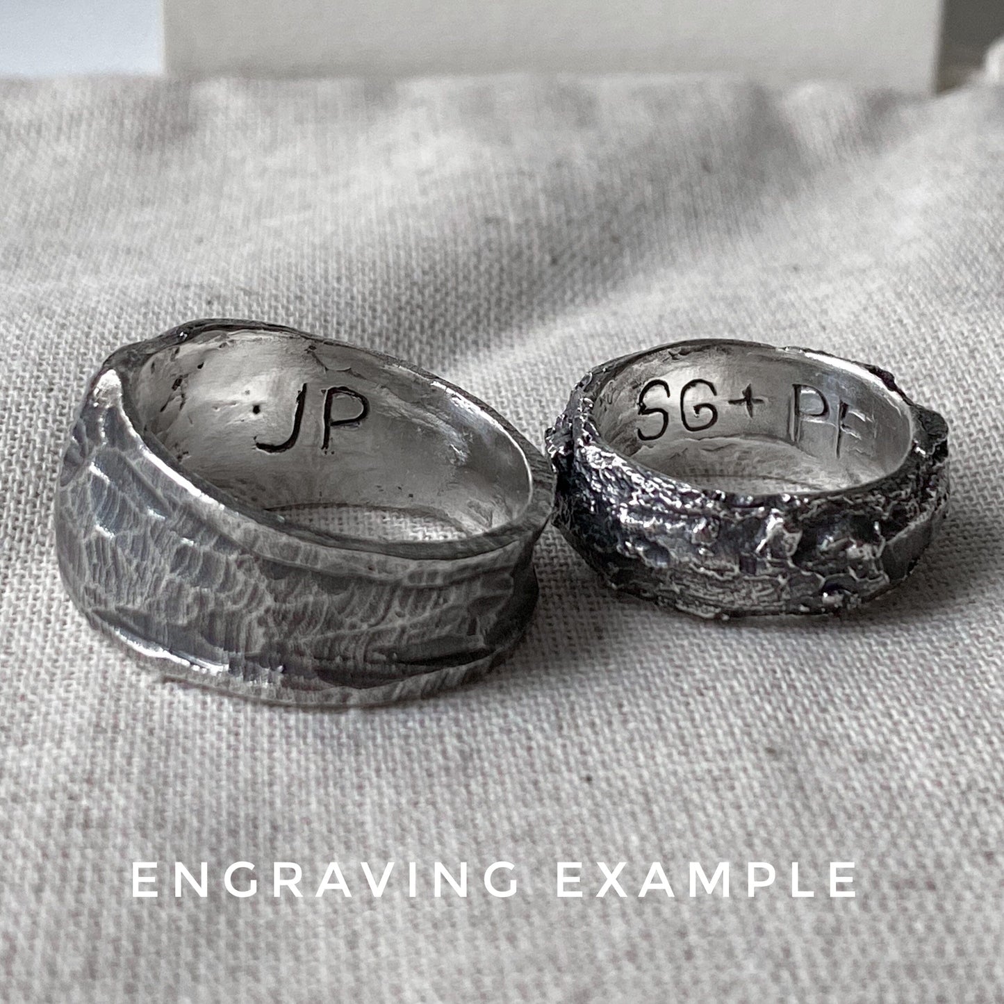 Si vous aimez notre police manuscrite (exemple dans la fiche produit), vous pouvez laisser vos initiales ou un mot secret à l'intérieur de la bague. Il suffit de les laisser dans la ligne "gravure" avant d'ajouter le produit au panier. Veuillez noter que ce service est disponible pour un maximum de cinq caractères.