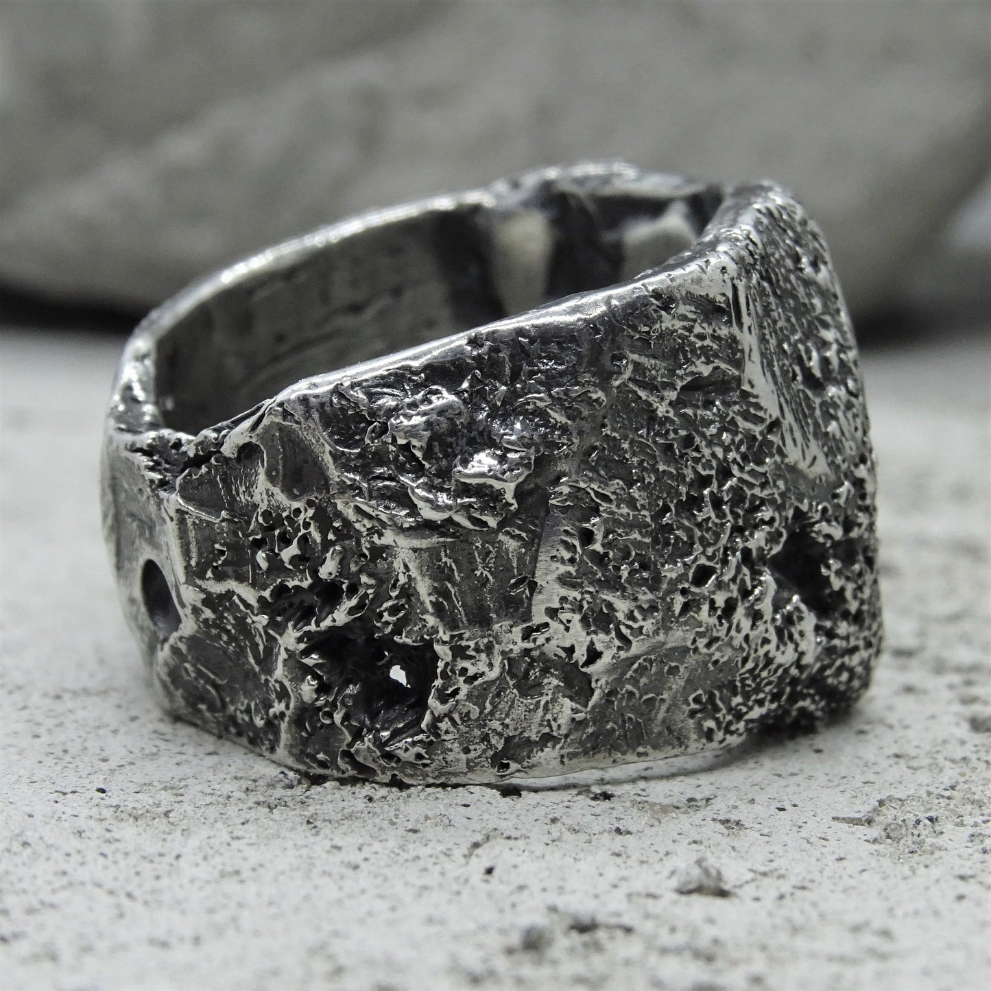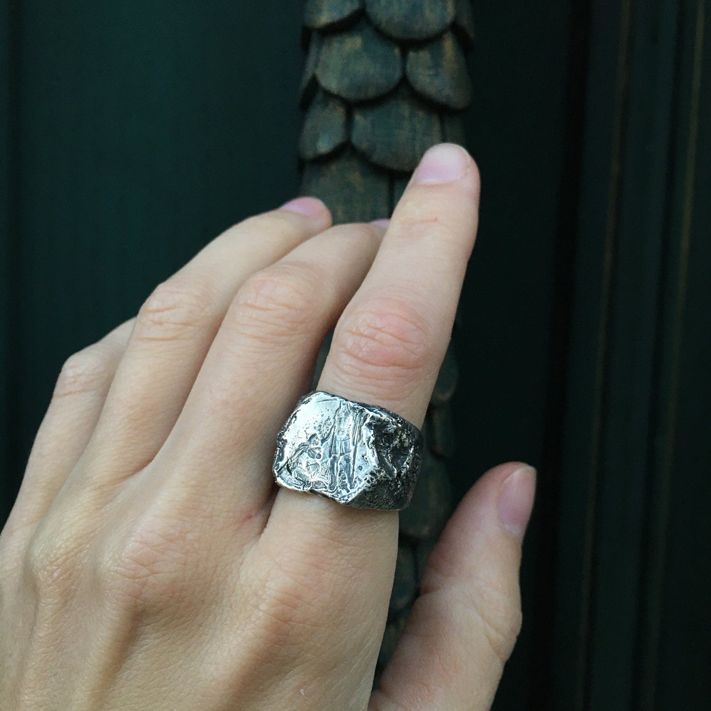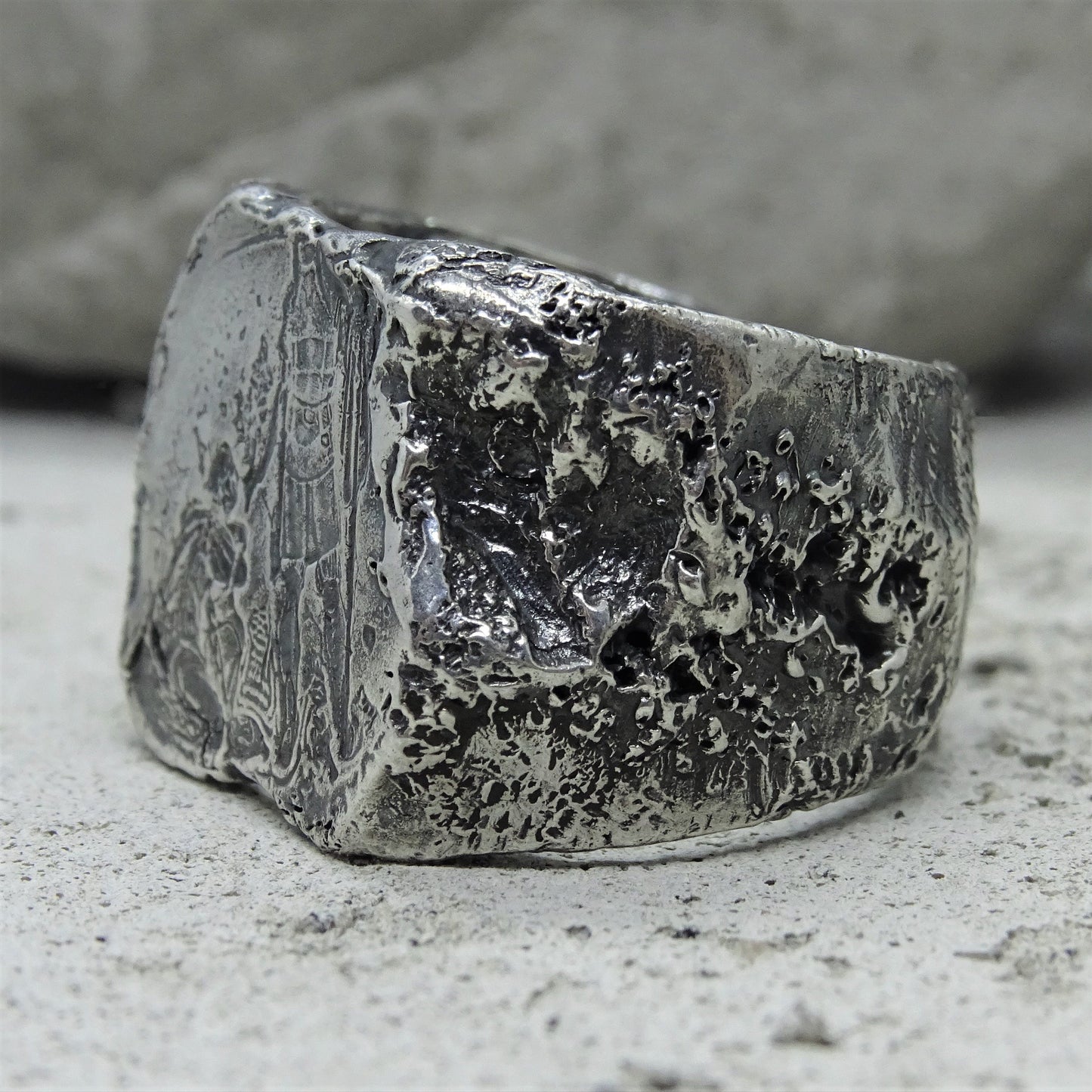 Type de traitement : oxydation volcanique + polissage Description : Une chevalière large avec une empreinte d'une vieille pièce de monnaie. On dirait qu'il a des centaines d'années et qu'il a été trouvé lors de fouilles. De là vient le nom. La texture unique est créée à la main, elle ressemble à la surface poreuse de la lune.