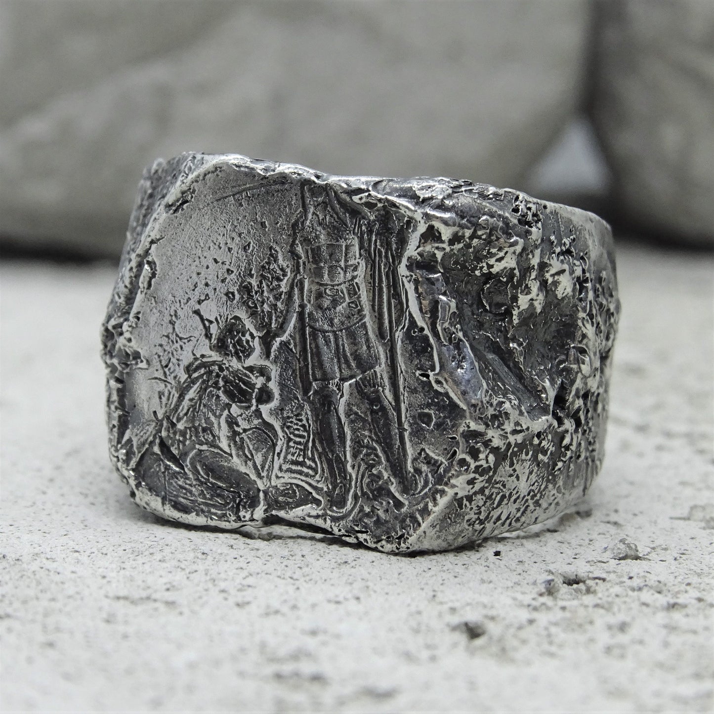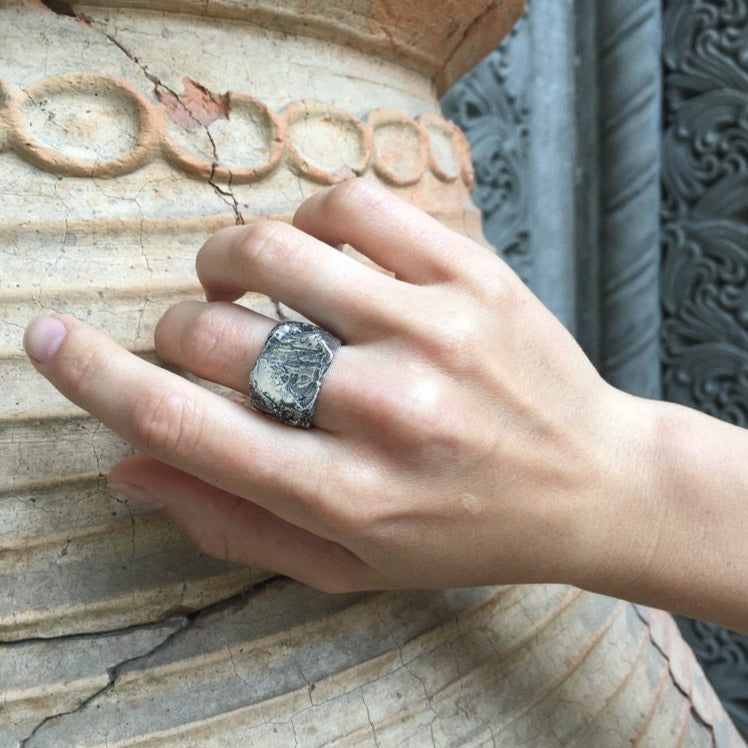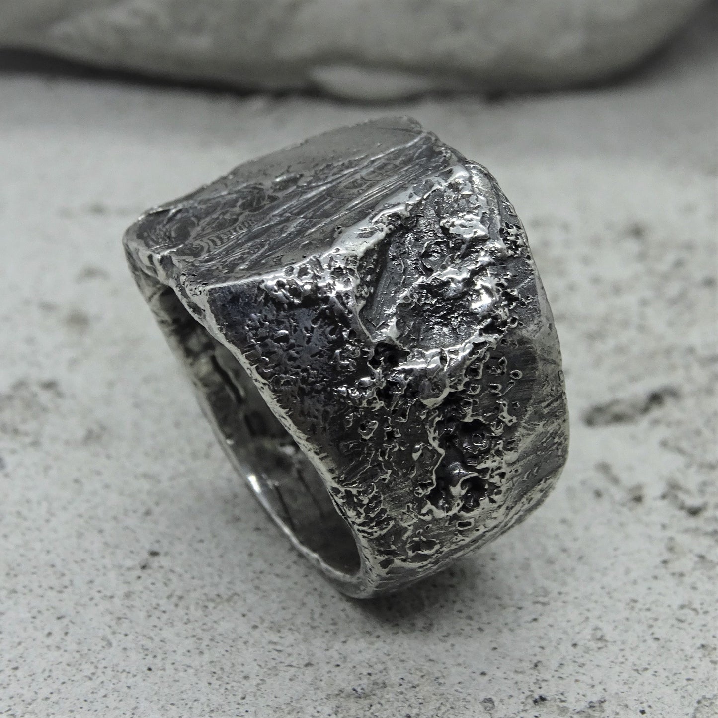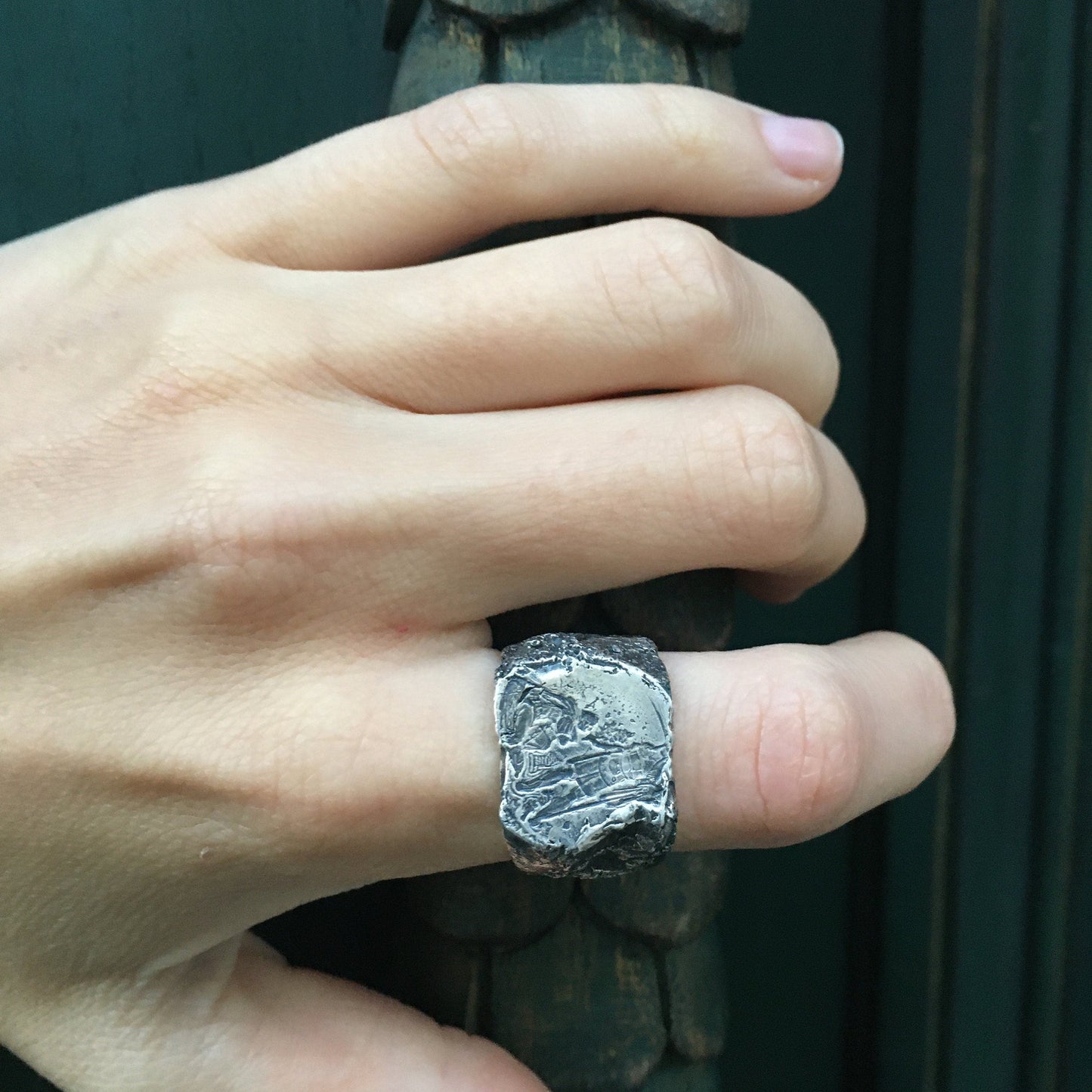 Type de traitement : oxydation volcanique + polissage Description : Une chevalière large avec une empreinte d'une vieille pièce de monnaie. On dirait qu'il a des centaines d'années et qu'il a été trouvé lors de fouilles. De là vient le nom. La texture unique est créée à la main, elle ressemble à la surface poreuse de la lune.