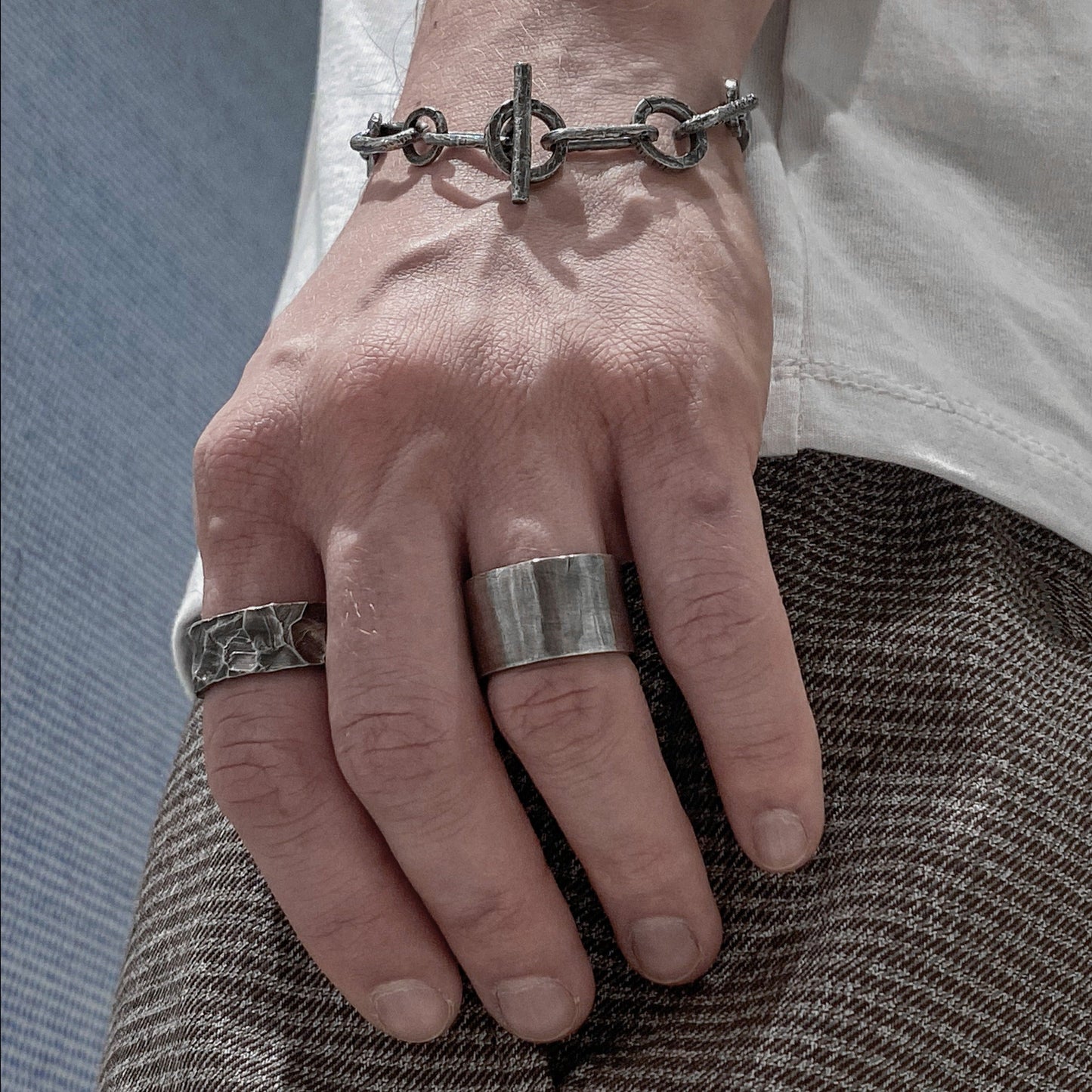 Tous les produits sont oxydés avec du soufre volcanique que nous avons collecté lors d'un voyage en Indonésie, ce qui les rend encore plus uniques. Chacun y trouvera quelque chose pour lui-même. Ajustement confortable. Il a fière allure sur la main à la fois seul et en combinaison avec d'autres bagues, se complétant parfaitement les uns les autres et votre image. Il deviendra le point culminant discret de votre image.