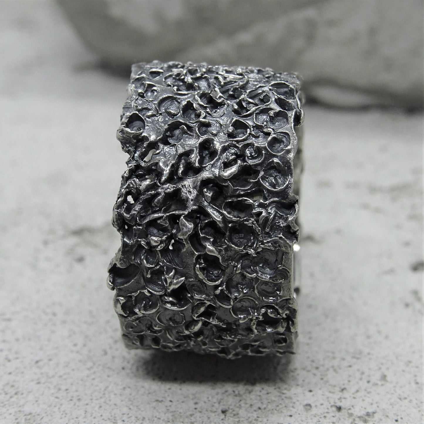 Descrizione: Anello extra largo e texture unica fatta a mano. Il nome parla da solo e questa è la mia associazione. La pioggia acida è adatta per gli amanti delle cose pratiche con un design unico. L'intera superficie è penetrata da fori di diversi diametri, alcuni di loro sono attraverso, altri no. In ogni caso, sembra molto impressionante e si adatta assolutamente a qualsiasi persona.
