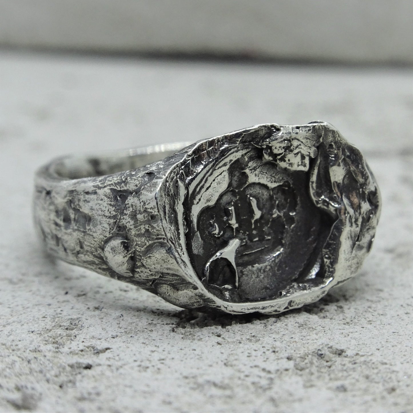 Descrizione: Anello elegante con texture in argento morbido fatto a mano e stampa corona sul davanti. Sono interessato alla storia. Questa è un'altra delle mie associazioni con il mondo antico. Volevo fare un anello simile a quelli che ho visto nei musei, dopo averli modernizzati un po '. Questo anello è un'impronta di un impero perduto che annega nelle sabbie e nel tempo.
