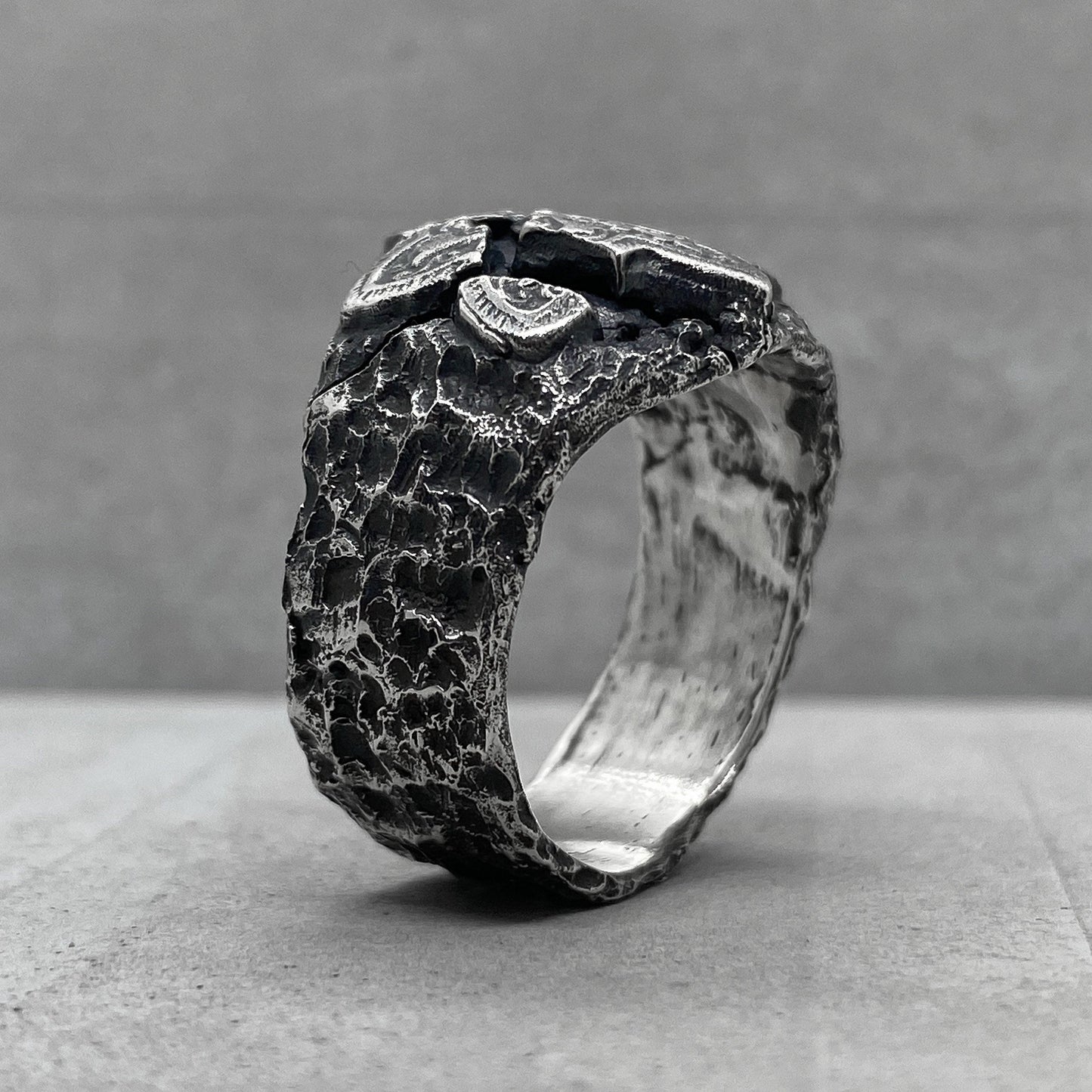 説明:このリングは、発掘中に見つかった東洋のモザイクの一部に関連付けられています。リングの表面全体に、物語を語ろうとしているように、変わった質感やひび割れが見られます。これらの測定値は異なる場合があります。サイズによって異なります。
