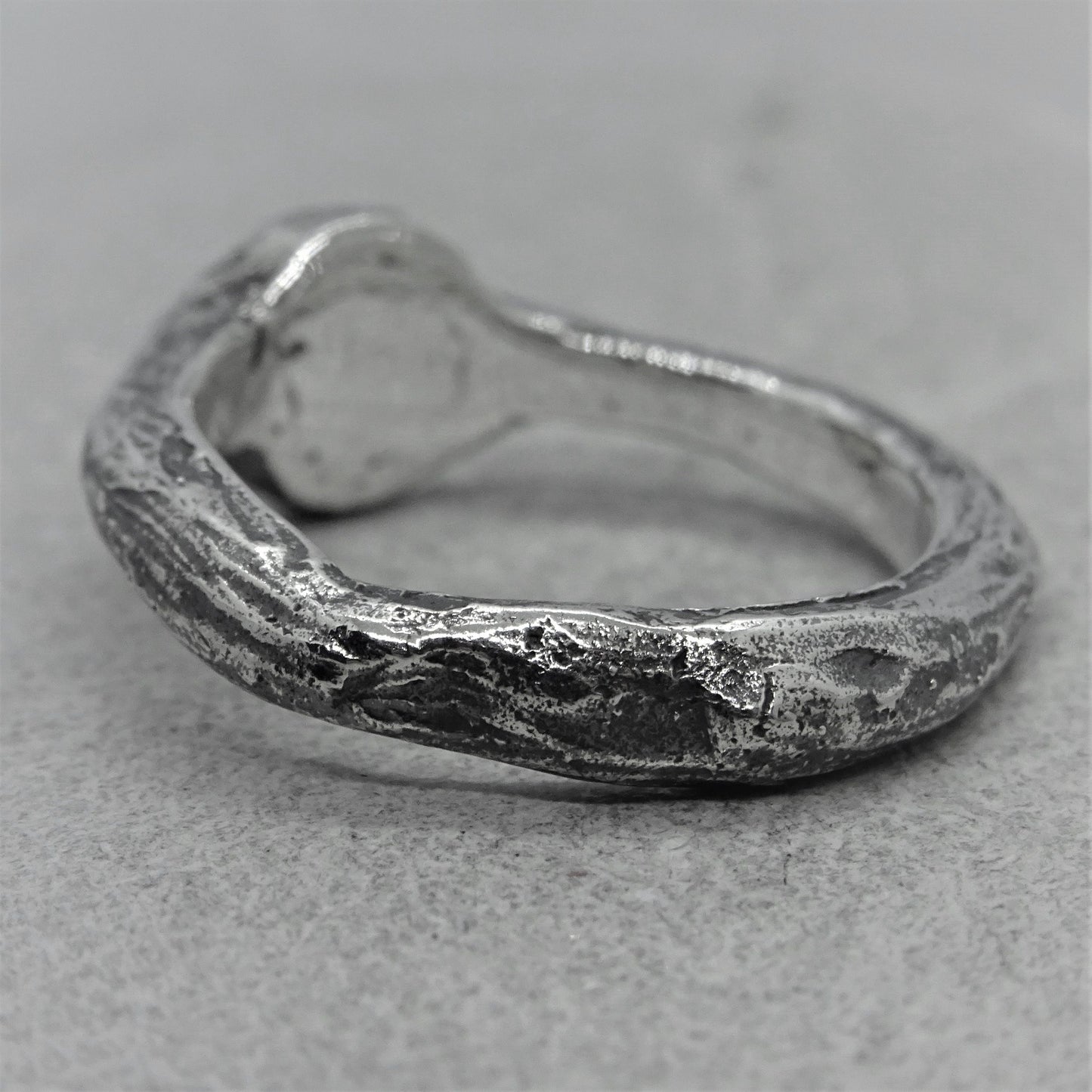 A slightly asymmetrical handmade silver ring will be your favorite item or a great gift. The surface of the ring is covered with small grooves resembling the traces of a meteor shower on the surface of the Moon.