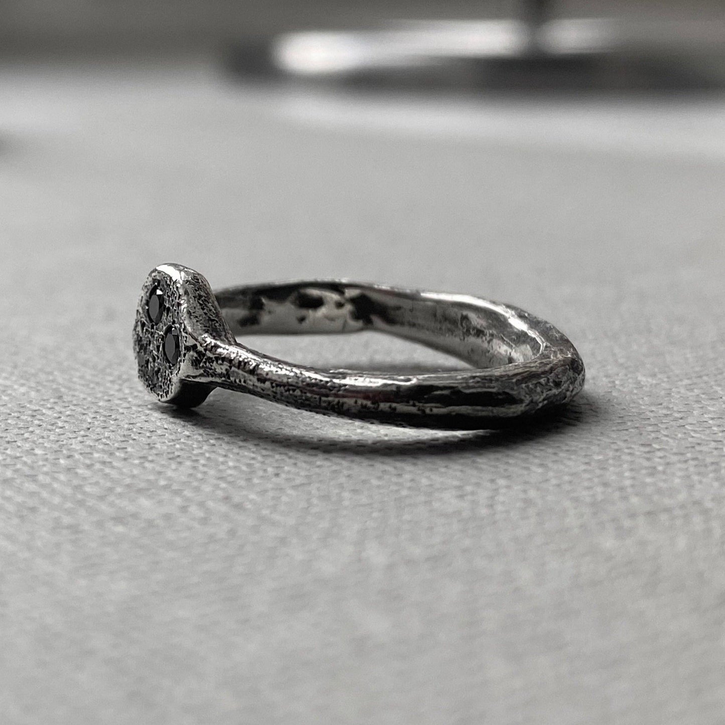 - textured silver ring with two black diamonds